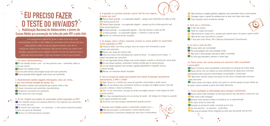 Este questionário poderá lhe ajudar a saber como anda a sua vulnerabilidade ao HIV e à Aids. Podem ser assinaladas várias alternativas para cada questão e pode ser que, em algumas questão, você não se encaixe em nenhuma das alternativas. Não precisa colocar seu nome e nem entregar o questionário para ninguém. Quando terminar de responder faça a soma da cores assinaladas e veja sua situação no final do questionário.